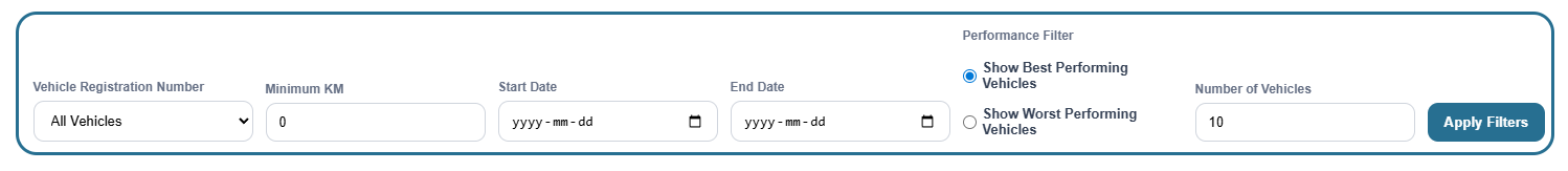 Good filtering helps you improve the quality of your analysis. For example, a vehicle with very low kilometres may not give a fair performance picture, while date filters help you compare specific operational periods.